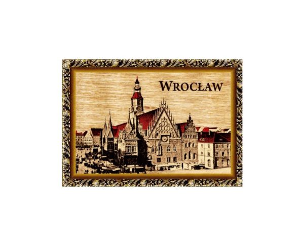 Magnes wykonany ze sklejki z nadrukowaną grafiką przedstawiającą zabytki Wrocławia.