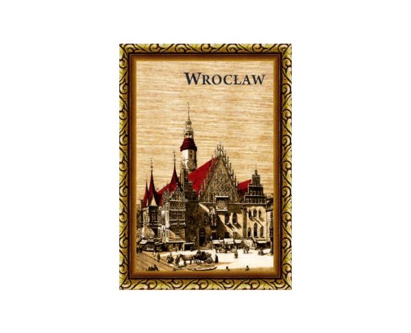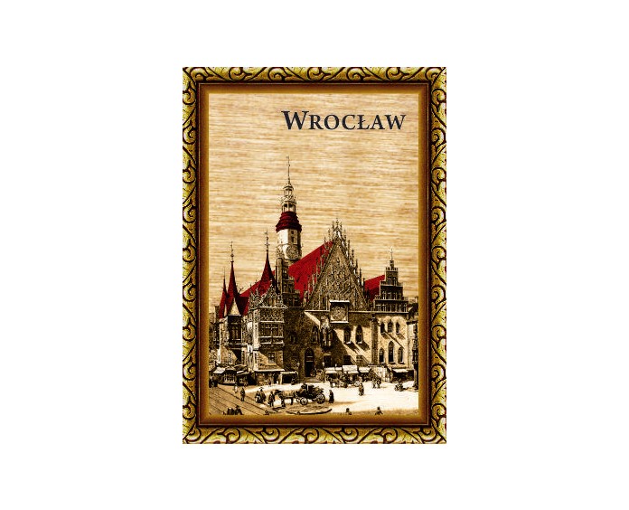 Magnes wykonany ze sklejki z nadrukowaną grafiką przedstawiającą zabytki Wrocławia.