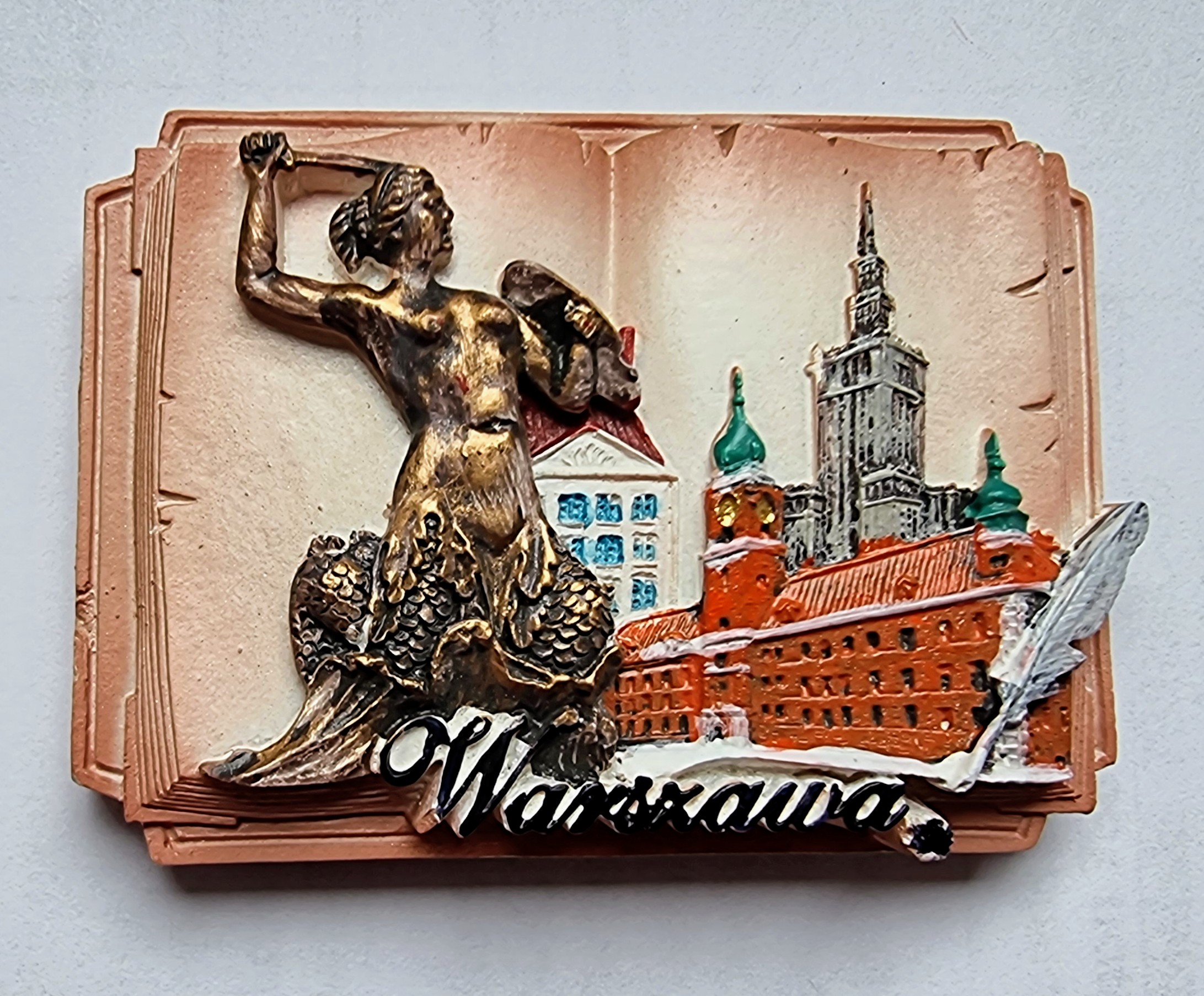 Magnes ceramiczny ręcznie malowany przedstawiający Syrenkę oraz Pałac Kultury i Nauki w Warszawie.
