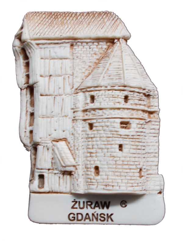 Magnes z żywicy syntetycznej przedstawiający gdański Żuraw na Długim Pobrzeżu z profilu.