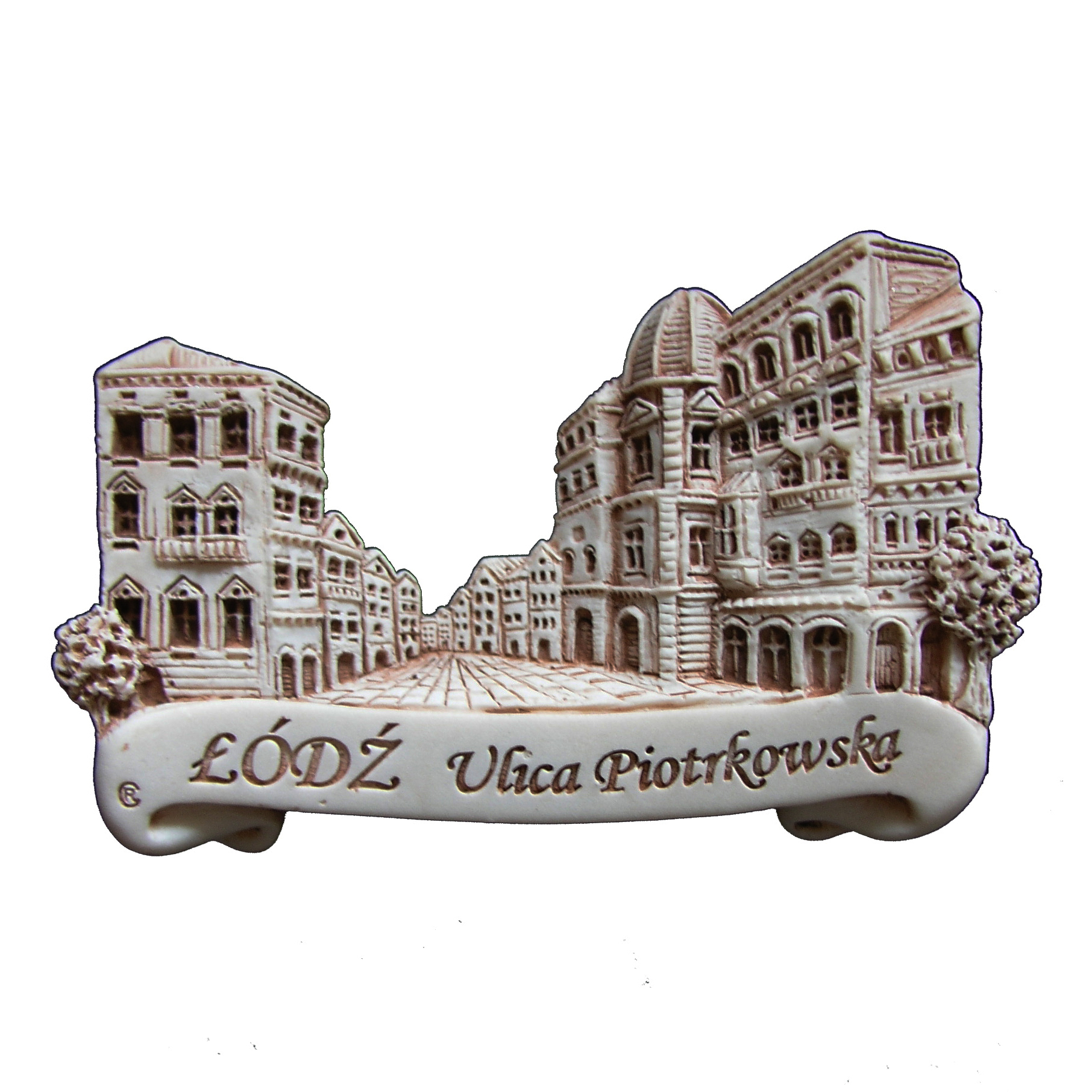 Magnes z żywicy syntetycznej przedstawiający ulicę Piotrkowską w Łodzi.