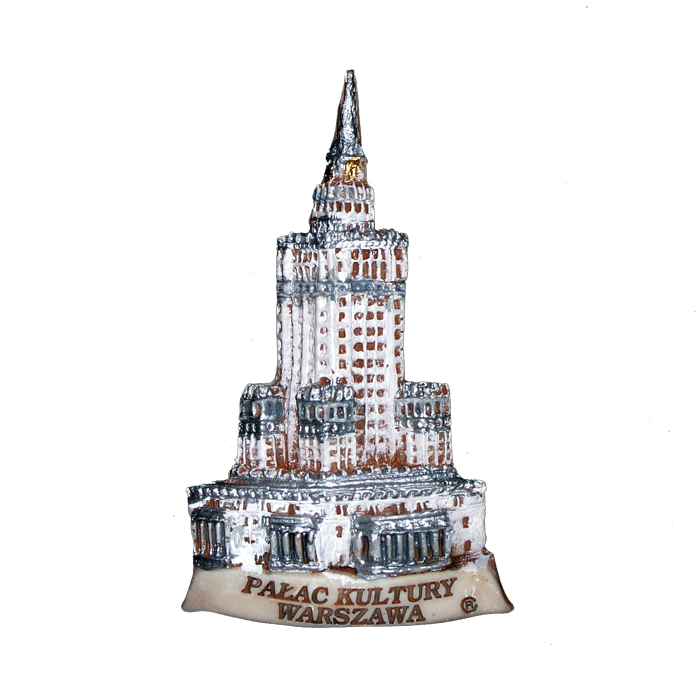 Magnes z żywicy syntetycznej przedstawiający warszawski Pałac Kultury.