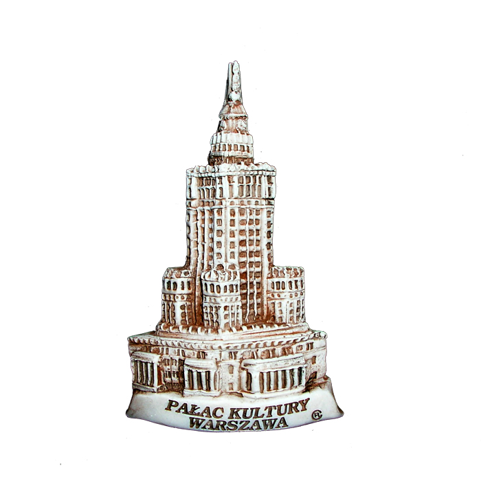 Magnes z żywicy syntetycznej przedstawiający warszawski Pałac Kultury.