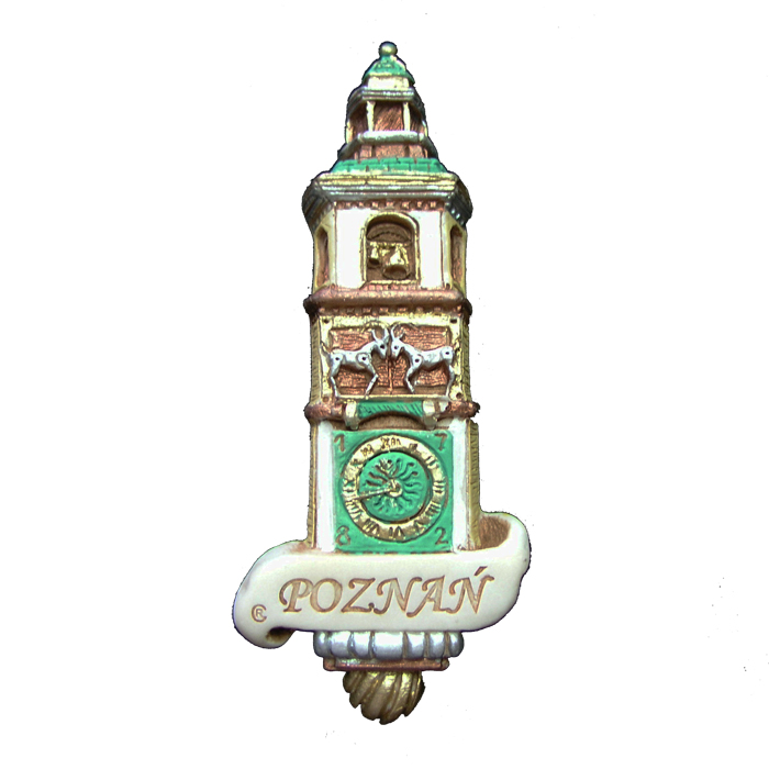 Magnes z żywicy syntetycznej przedstawiający wieżę ratusza w Poznaniu.