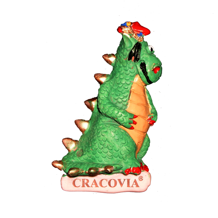 Magnes z żywicy syntetycznej przedstawiający smoka wawelskiego.
