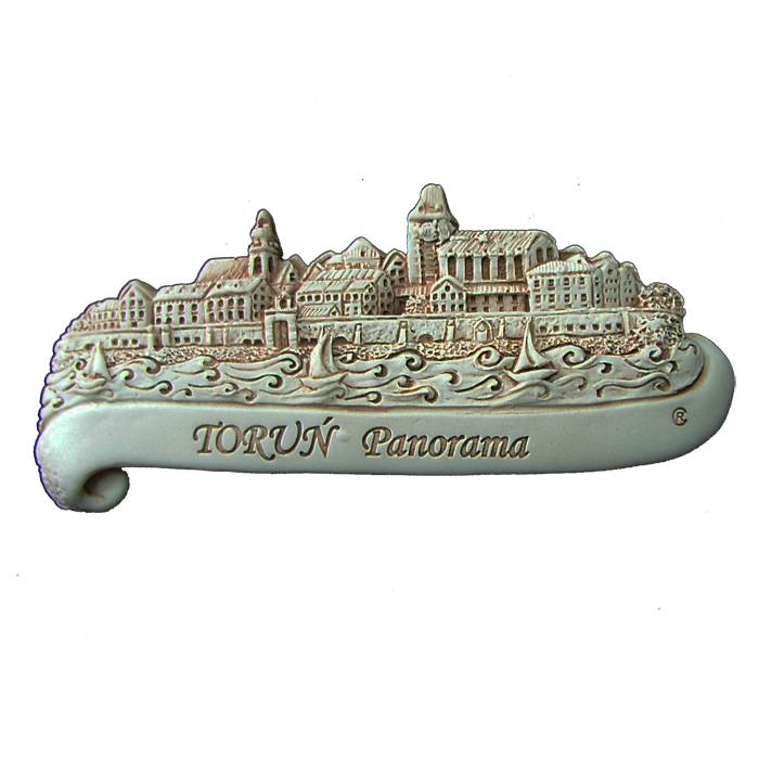 Magnes z żywicy syntetycznej przedstawiający panoramę Torunia.