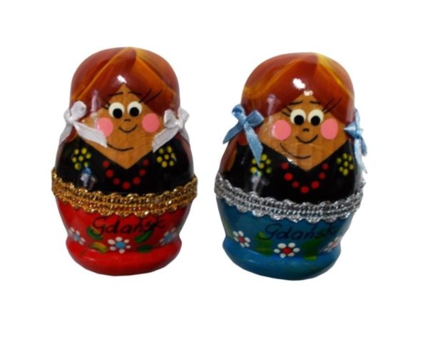 Drewniana lalka z napisem Gdańsk i magnesem.