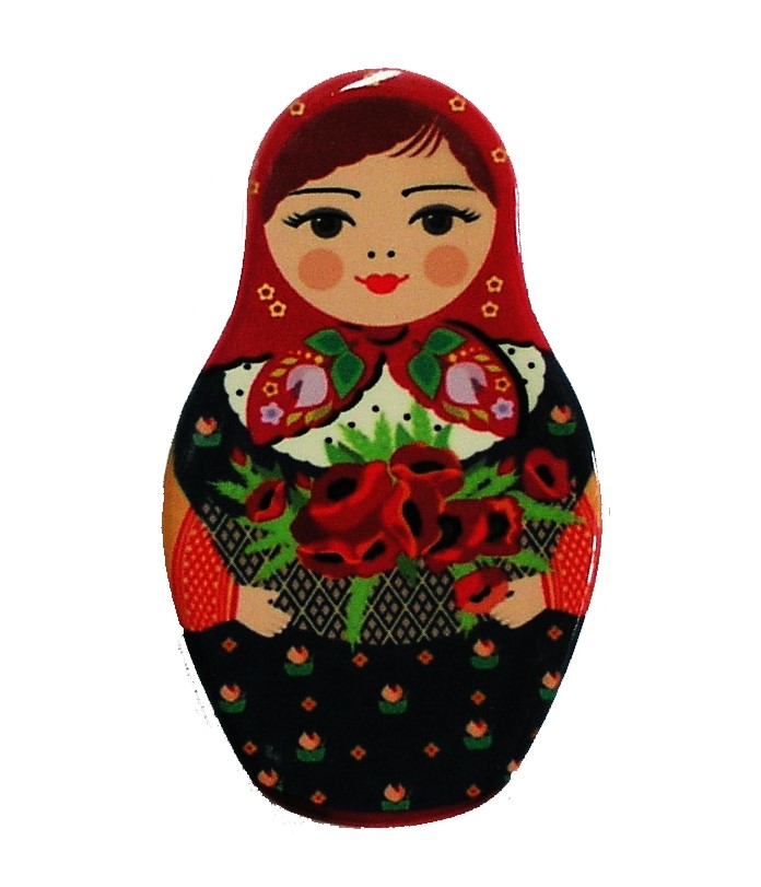 Magnes ceramiczna, z nadrukowanym wizerunkiem matrioszki.