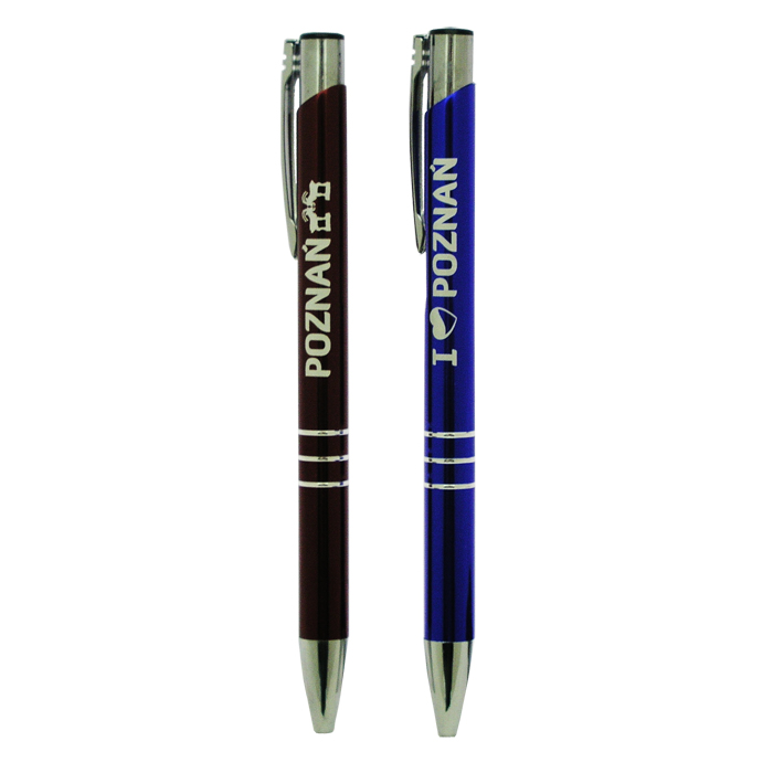 Metalowy długopis z wygrawerowanym napisem I love Poznań lub Poznań w różnych kolorach.