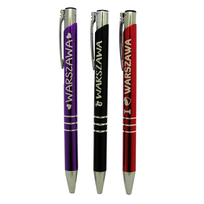Metalowy długopis z wygrawerowanym napisem I love Warszawa lub Warszawa w różnych kolorach.