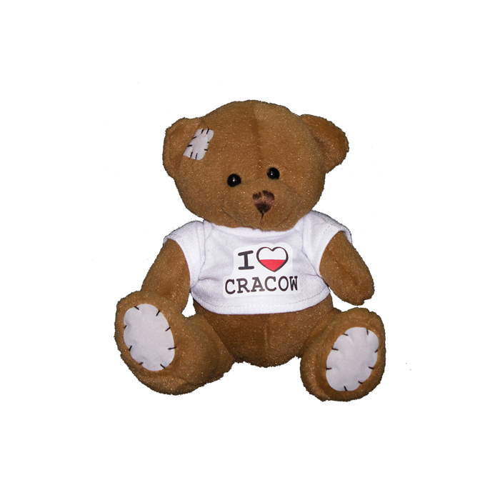 Pluszowy miś z łatką w białej koszulce z napisem “I love Cracow”.