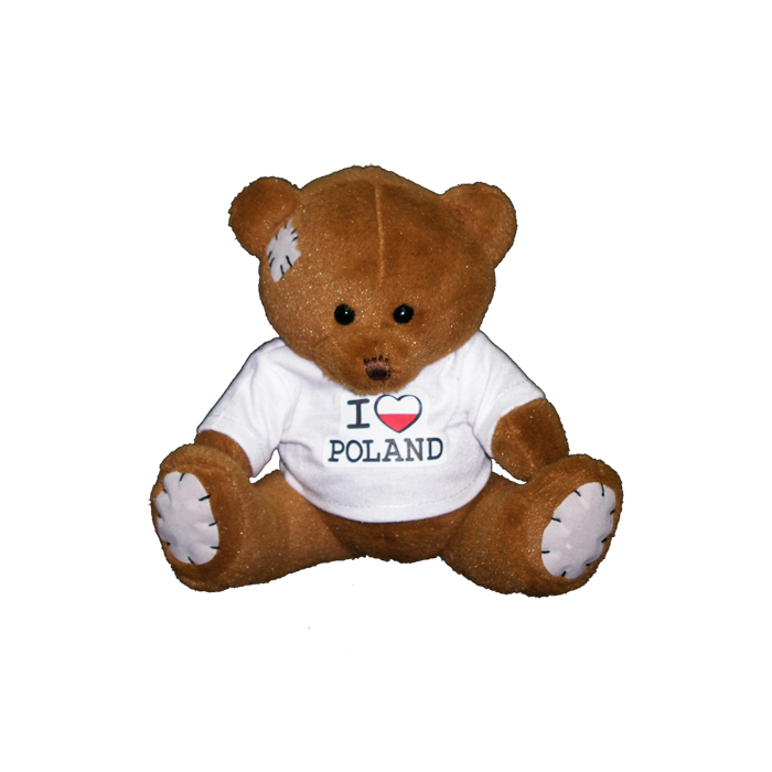 Pluszowy miś z łatką w białej koszulce z napisem “I love Poland”.