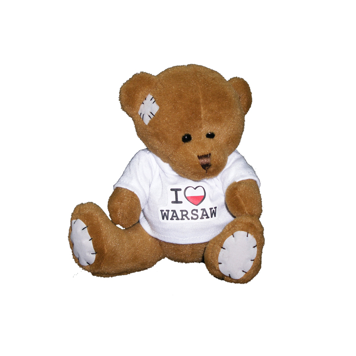 Pluszowy miś z łatką w białej koszulce z napisem “I love Warsaw”.