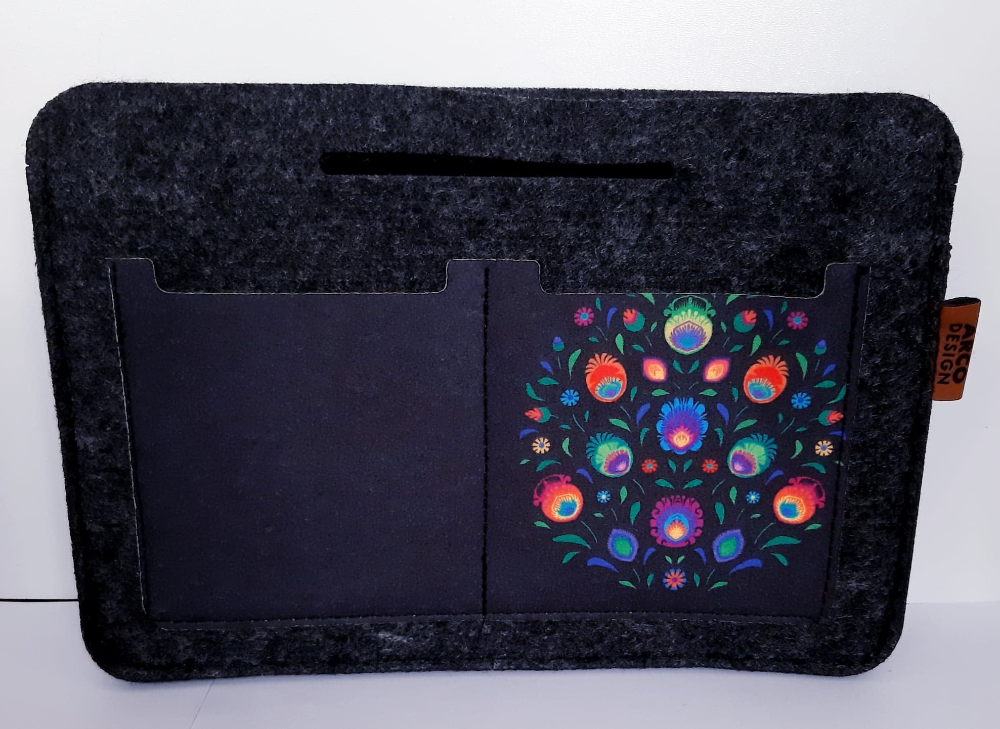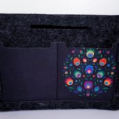 Organizer – model PREMIUM OBEREK w kolorze czarnym z nadrukiem w stylu folk, wykonany z wysokiej jakości ekologicznego filcu. Organizer pełni funkcje pomocnika w utrzymaniu porządku w damskiej torebce, co jest problemem większości kobiet. W środku znajdują się dwie główne komory i dwie małe kieszonki, na zewnątrz jedna kieszeń zamykana zamkiem błyskawicznym.