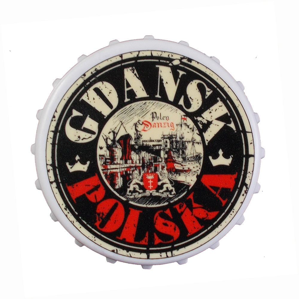 Plastikowy otwieracz, wzmacniany metalowa wkładką, w kształcie kapsla. Po wewnętrznej stronie przytwierdzony magnes, umożliwiający umocowanie go na np. lodówce. Ozdobiony pamiątkowym nadrukiem z zabytkami Gdańska. Posiada funkcję ponownego zamknięcia butelki.