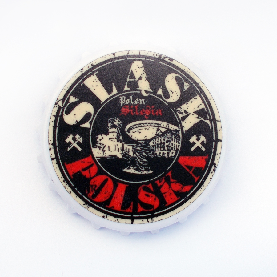 Plastikowy otwieracz, wzmacniany metalowa wkładką, w kształcie kapsla. Po wewnętrznej stronie przytwierdzony magnes, umożliwiający umocowanie go na np. lodówce. Ozdobiony pamiątkowym nadrukiem z zabytkami Śląska. Posiada funkcję ponownego zamknięcia butelki.