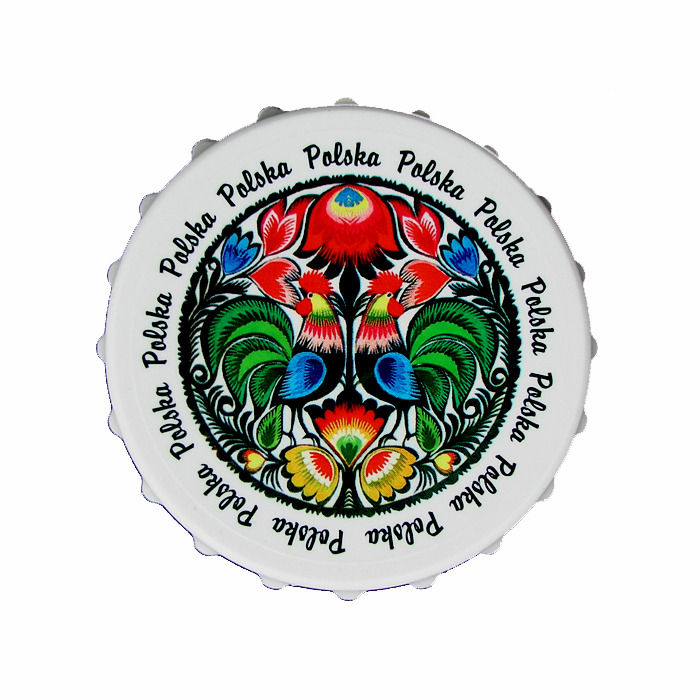 Plastikowy otwieracz, wzmacniany metalowa wkładką, w kształcie kapsla. Po wewnętrznej stronie przytwierdzony magnes, umożliwiający umocowanie go na np. lodówce. Ozdobiony nadrukiem przedstawiającym wzór łowicki. Posiada funkcję ponownego zamknięcia butelki.