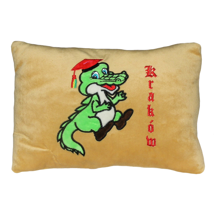 Pluszowa, zielona poduszka z wizerunkiem smoka i napisem Kraków.