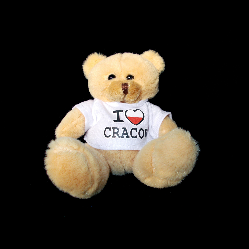 Pluszowy miś jasny lub ciemny w koszulce z napisem.