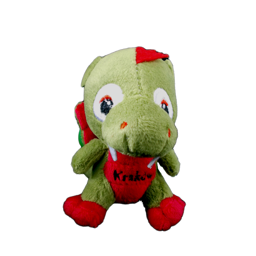 Brelok z zielonym, pluszowym smokiem wawelskim. Smok z napisem Kraków na brzuchu.