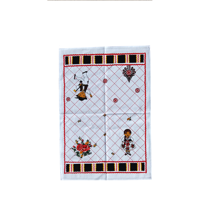 Ściereczka kuchenna ozdobiona parą góralską oraz innymi wzorami góralskimi.