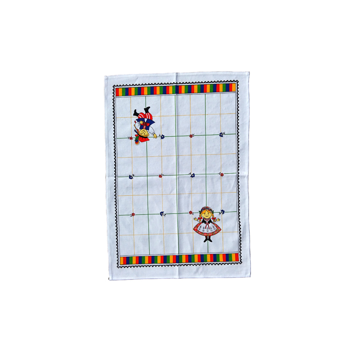 Ściereczka kuchenna ozdobiona parą krakowską oraz innymi wzorami krakowskimi.
