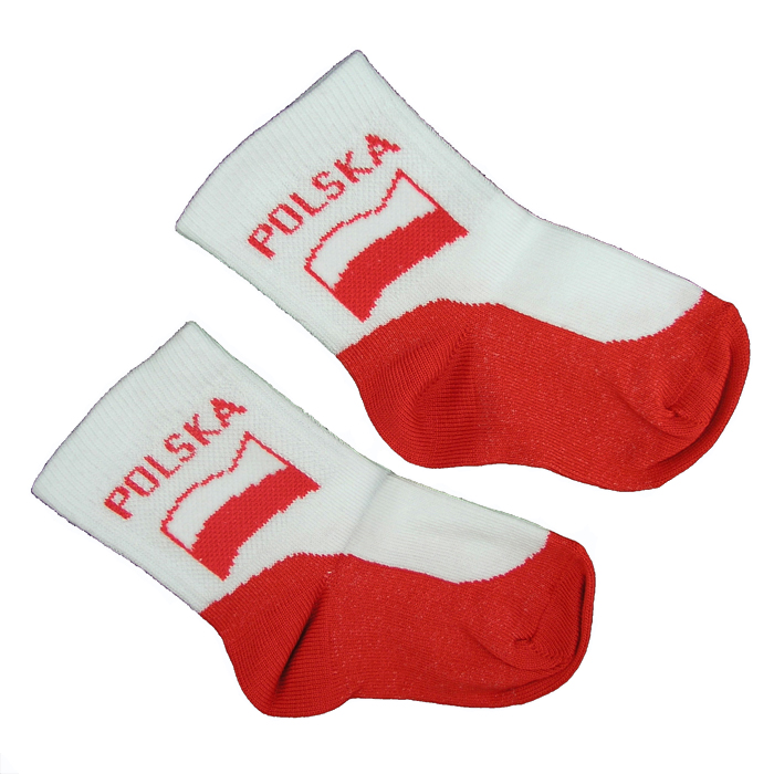 Czerwono białe skarpetki dziecięce z flagą Polski oraz napisem Polska.