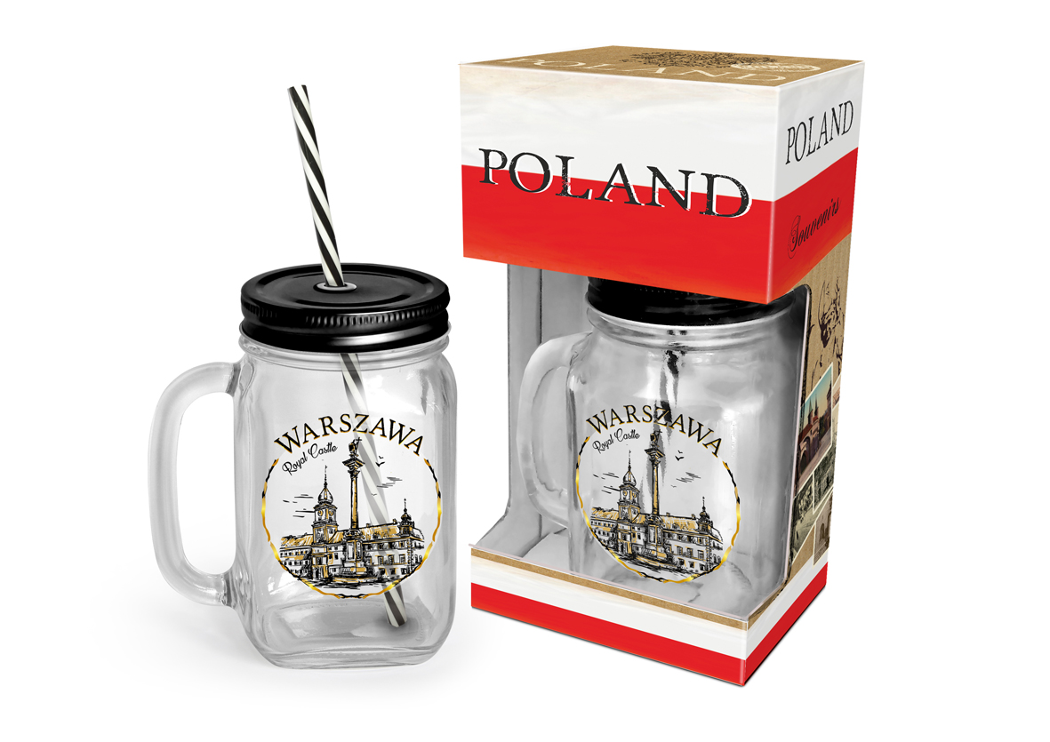 Słoik z rurką ozdobiony grafiką przedstawiającą Plac Zamkowy w Warszawie. Produkt zapakowany jest w ozdobne pudełko.