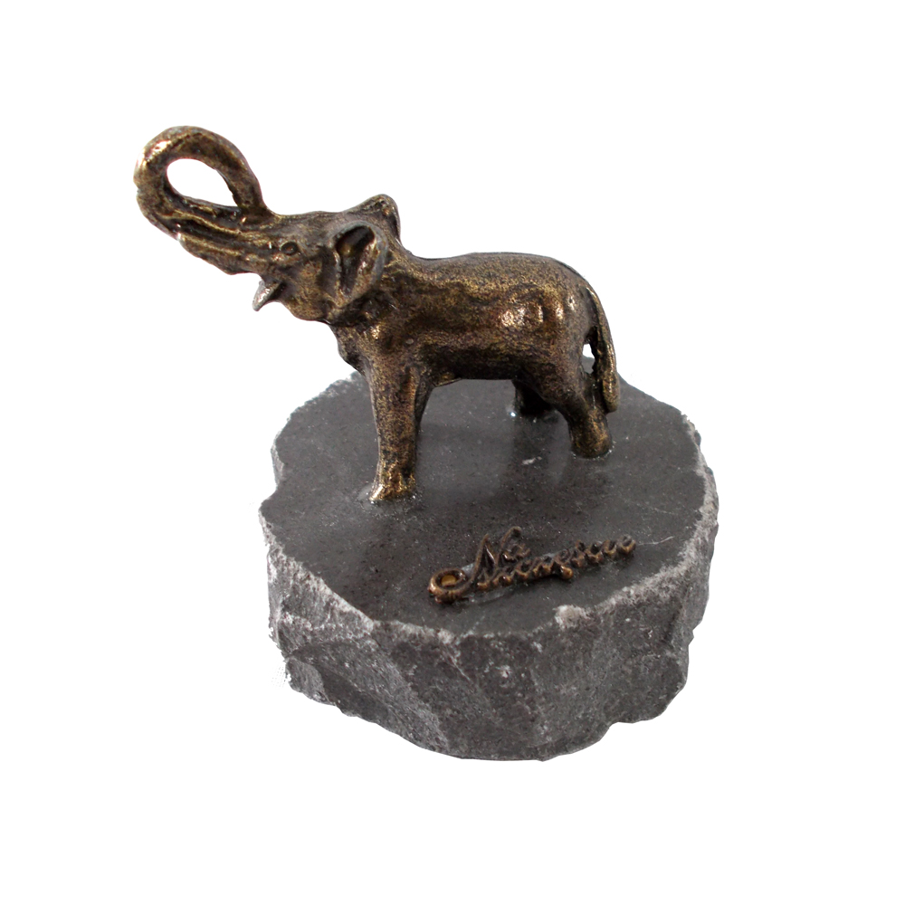 Metalowa figurka słonia na kamieniu o różnych kolorach.