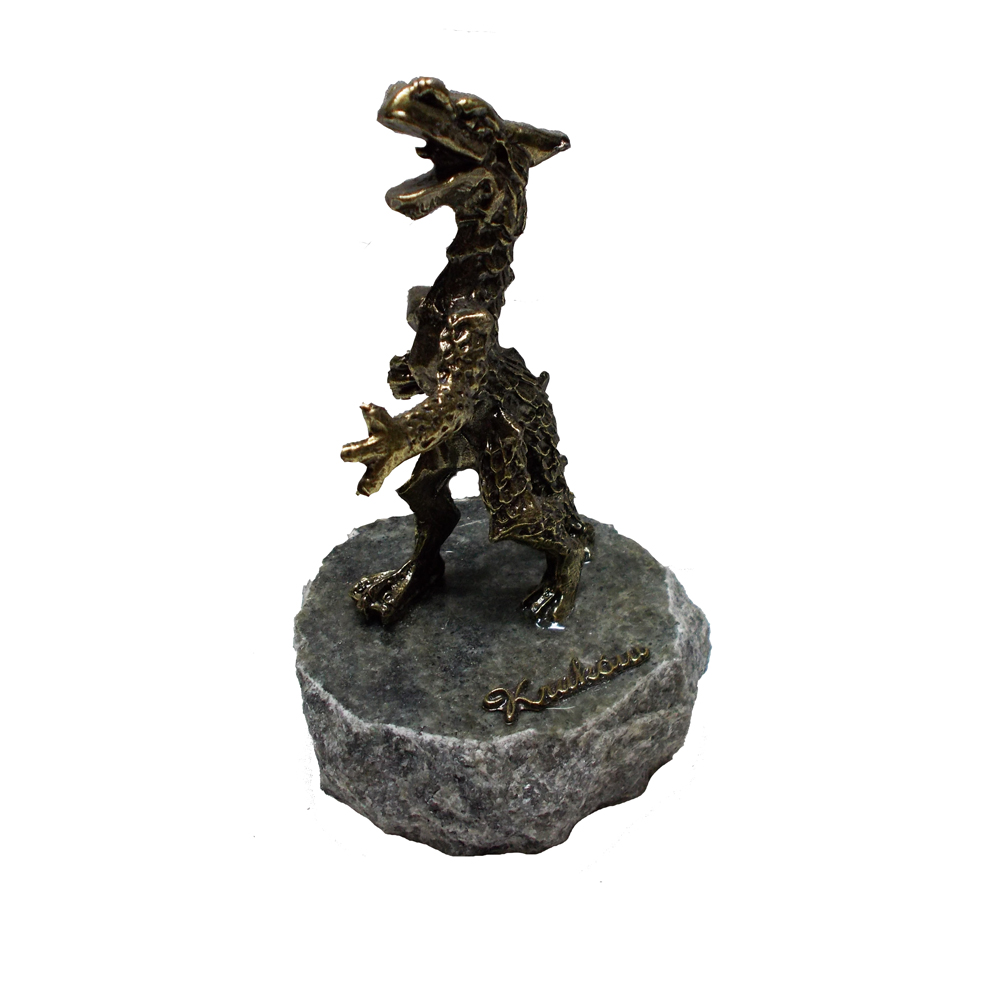 Metalowa figurka smoka na kamieniu o różnych kolorach.