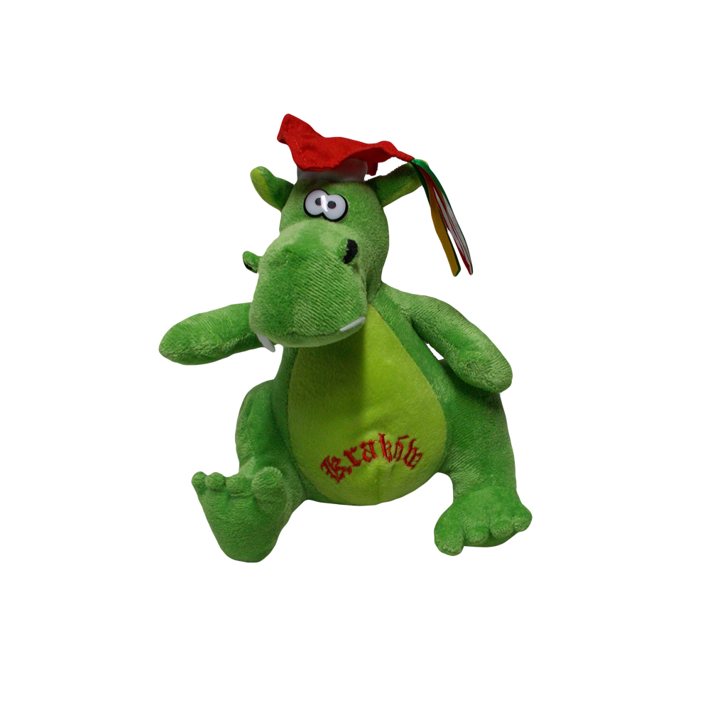 Pluszowa, zielona maskotka smoka. Smok w czapce krakowskiej i wyszytym napisem Kraków na brzuchu.