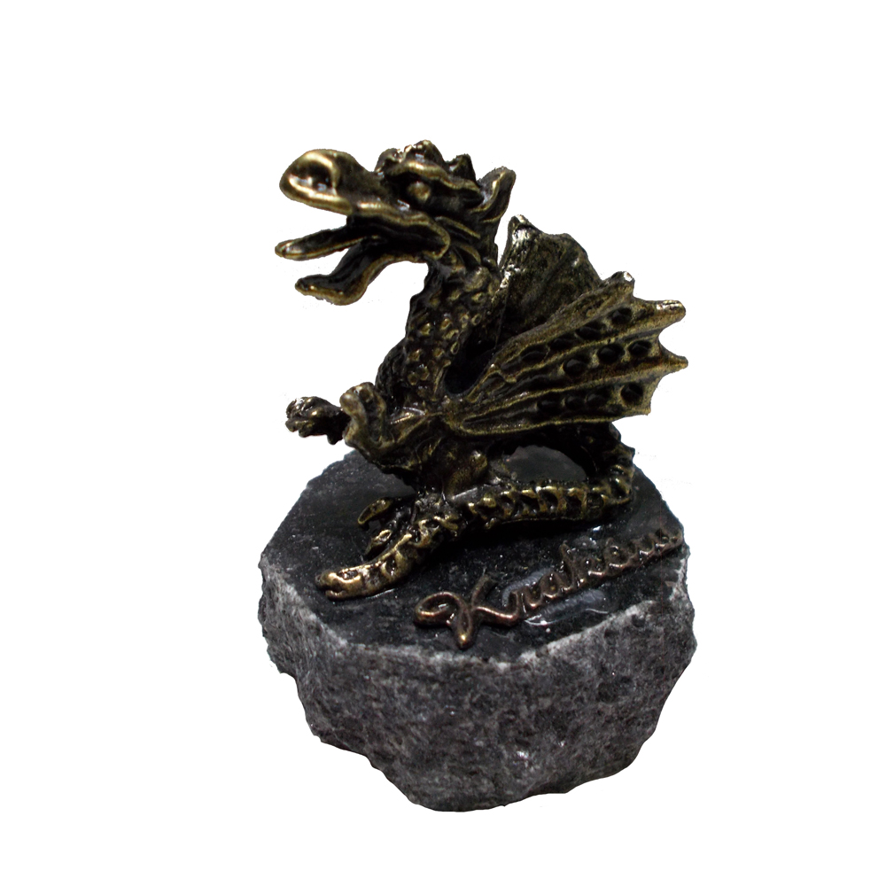 Metalowa figurka smoka ze skrzydłami na kamieniu o różnych kolorach z napisem Kraków.