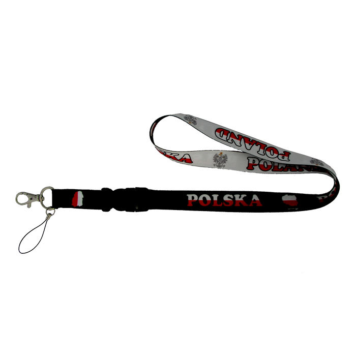 Czarno-biała smycz z poliestru, z nadrukowanym napisem “Polska” oraz orłem. Posiada dwie końcówki: karabińczyk oraz końcówkę do telefonu.