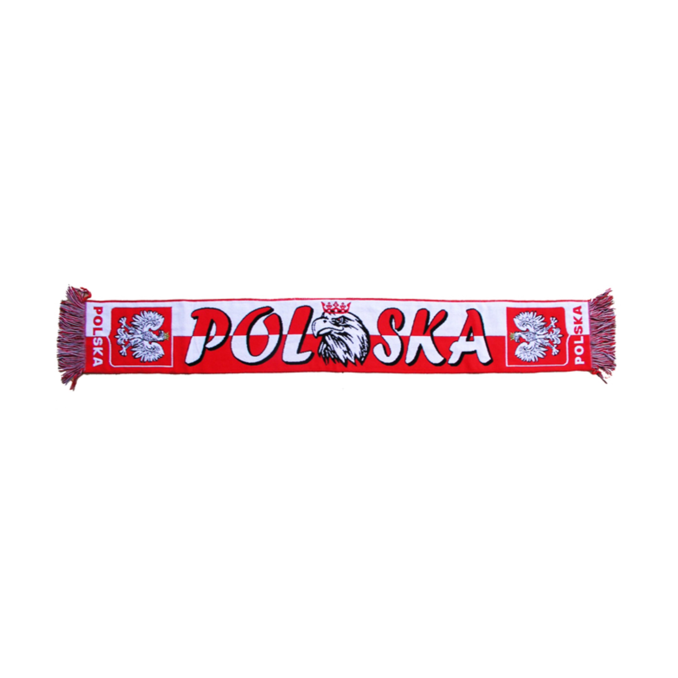 Szalik Polska dwustronny , dziany. Materiał: 100% akryl. Produkt Polski, jakość pierwsza. Na końcach szalika ozdobiony dwoma godłami Polski. Podzielony w poziomie na dwa kolory, biały i czerwony. Napis Polska na środku przedziela głowa orła w koronie.