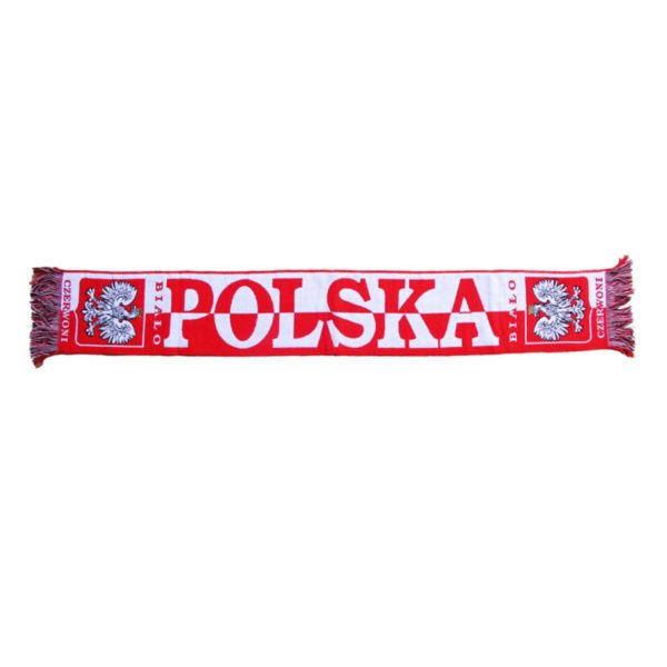 Szalik Polska dwustronny , dziany. Materiał: 100% akryl. Produkt Polski, jakość pierwsza. Na końcach szalika ozdobiony dwoma godłami Polski. Podzielony w poziomie na dwa kolory, biały i czerwony. Napis Polska na środku ma kolory odwrotnie niż tło.