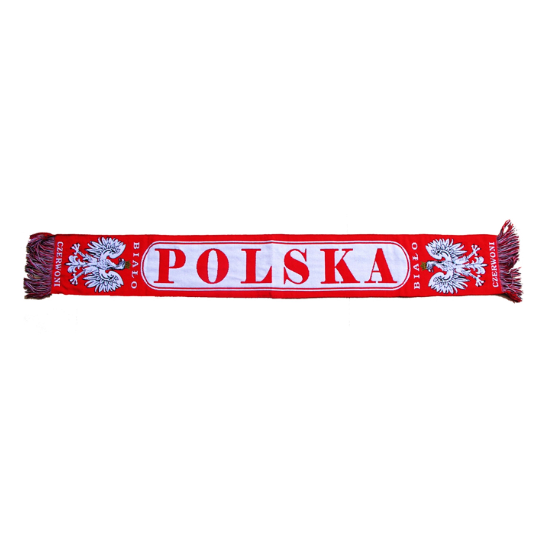 Szalik Polska dwustronny , dziany. Materiał: 100% akryl. Produkt Polski, jakość pierwsza. Na końcach szalika ozdobiony dwoma godłami Polski. Napis Polska na środku w kolorze czerwonym na białym tle w kształcie owalu.