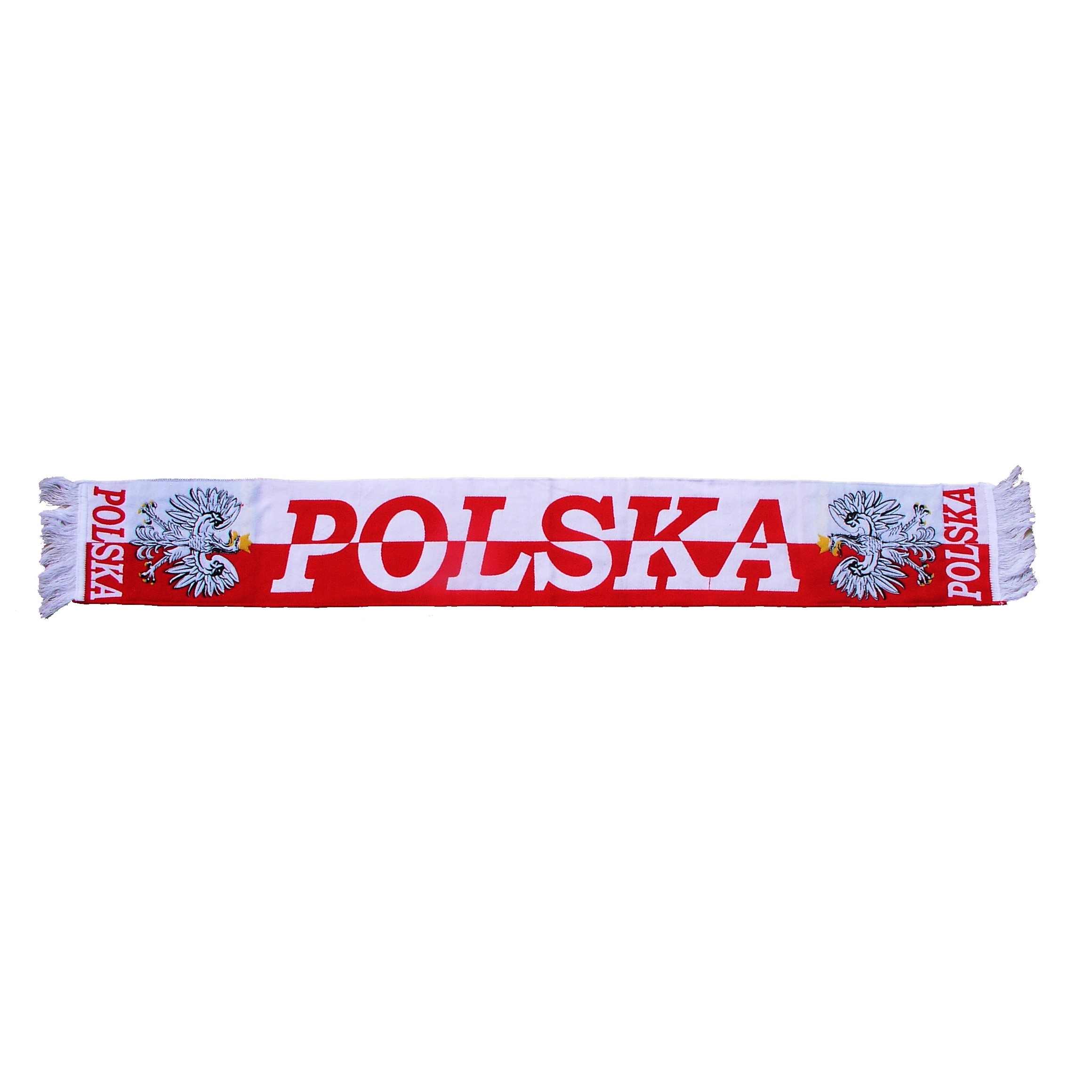Szalik Polska jednostronny , dziany. Materiał: 100% akryl. Produkt Polski, jakość pierwsza. Na końcach szalika ozdobiony dwoma orłami. Podzielony w poziomie na dwa kolory, biały i czerwony. Napis na środku przedzielony odwrotnie kolorami niż tło.