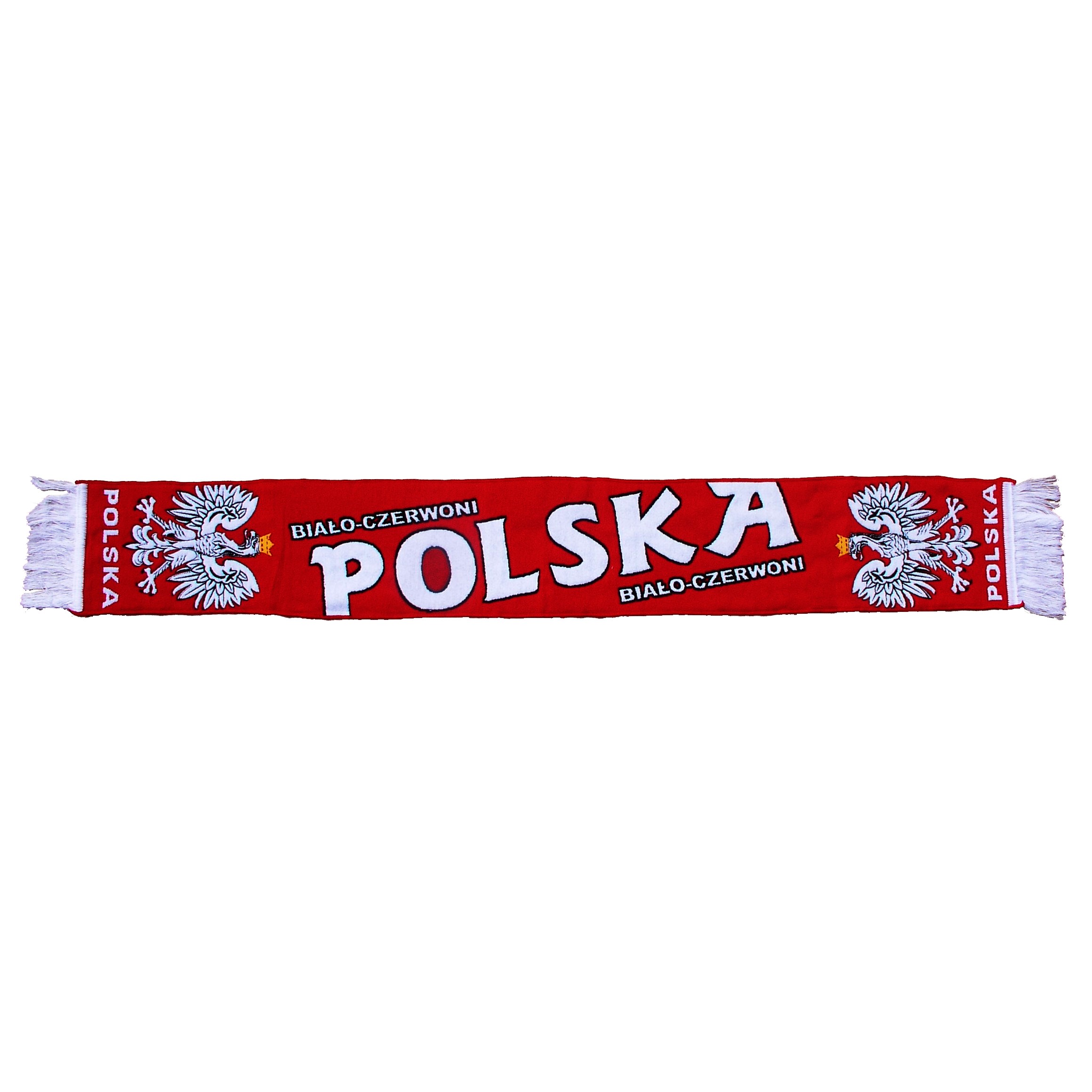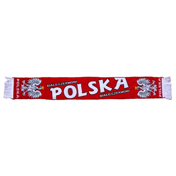 Szalik Polska jednostronny , dziany. Materiał: 100% akryl. Produkt Polski, jakość pierwsza. Na końcach szalika ozdobiony dwoma orłami. Napis Polska na środku wykonany pod skosem, nad nim i pod dodatkowy napis Biało-czerwoni.