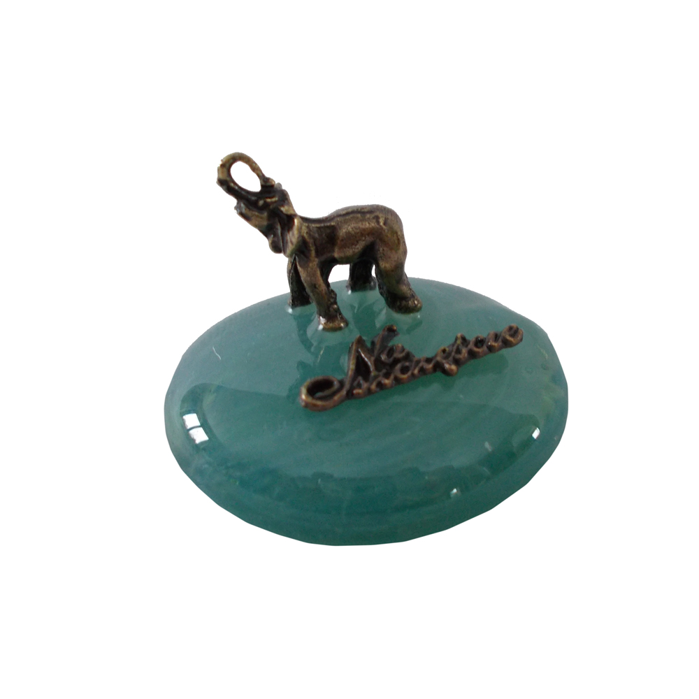 Metalowa figurka słonika na szklanym kamieniu o różnych kolorach z napisem Na szczęście.