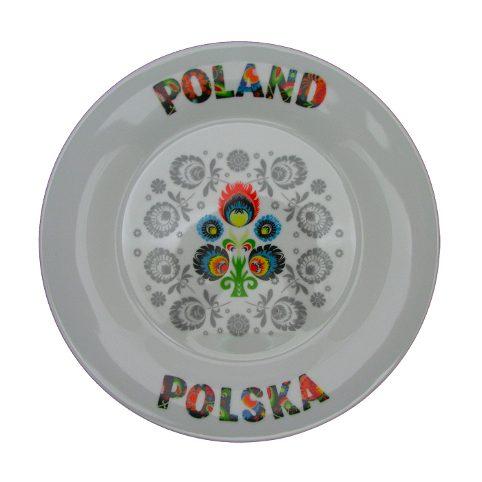 Talerz ceramiczny ze wzorem folklorystycznym.