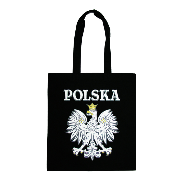 Czarna, bawełniana torba z nadrukowanym orłem oraz napisem Polska, z obrysowanym konturem w kolorze szarym.