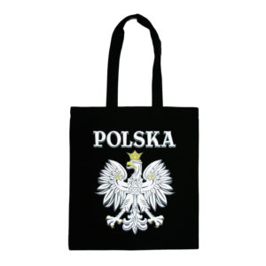 Czarna, bawełniana torba z nadrukiem przedstawiającą flagę Polski oraz napis Poland.