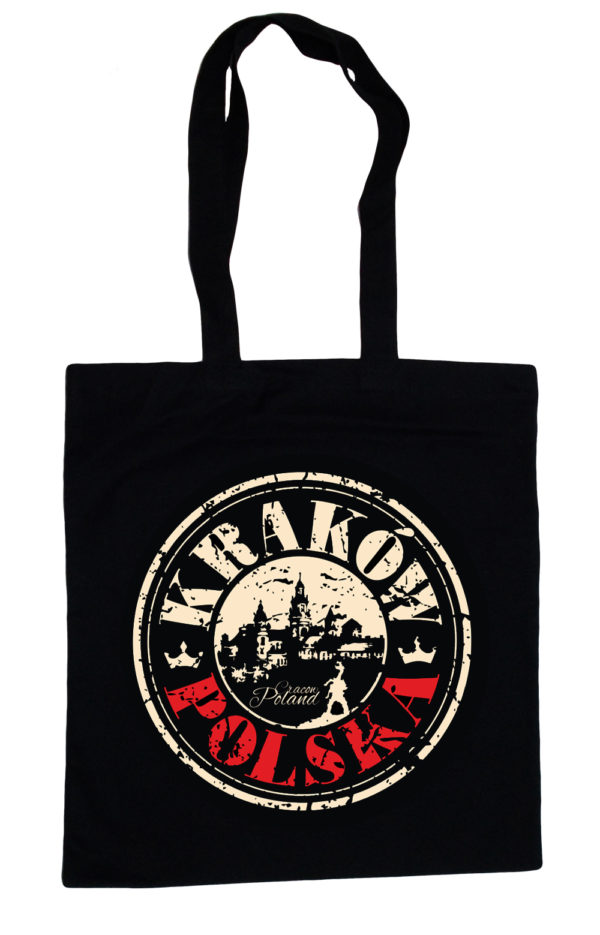 Czarna, bawełniana torba z nadrukowanym kołem. W środku koła przedstawione zabytki z Krakowa, a dookoła napisy Kraków i Polska.