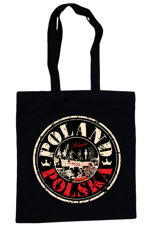Czarna, bawełniana torba z nadrukowanym kołem. W środku koła przedstawione zabytki z Polski, a dookoła napisy Polska i Poland.