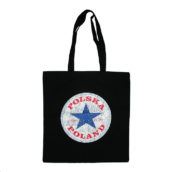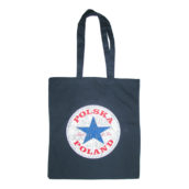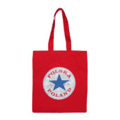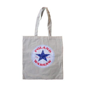 Bawełniana torba z nadrukowaną gwiazdą oraz napisami “Polska” i “Poland”.