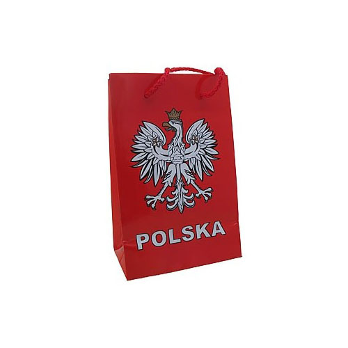 Czerwona torba papierowa na upominki. Ozdobiona z jednej strony wizerunkiem orła i napisem Polska, a z drugiej mapą Polski i napisem Poland.