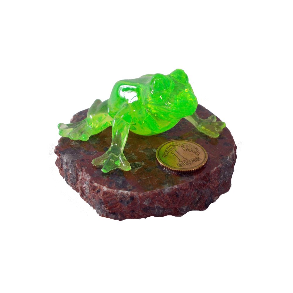 Plastikowa żaba z groszem na kamieniu o różnych kolorach.