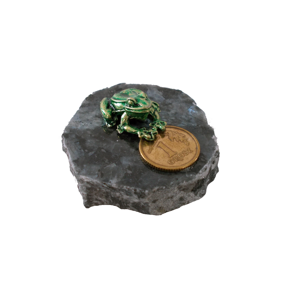 Metalowa żabka z groszem na kamieniu o różnych kolorach.