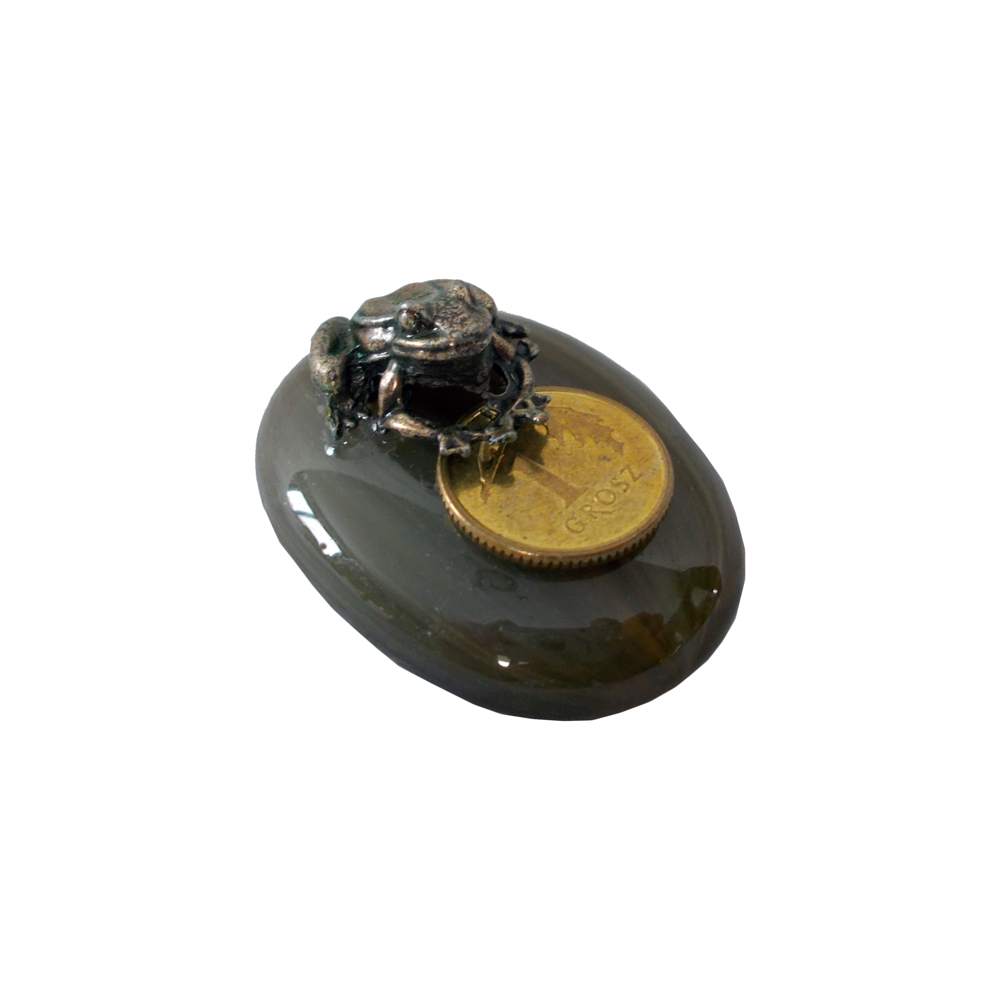 Metalowa żabka z groszem na szklanym kamieniu o różnych kolorach.