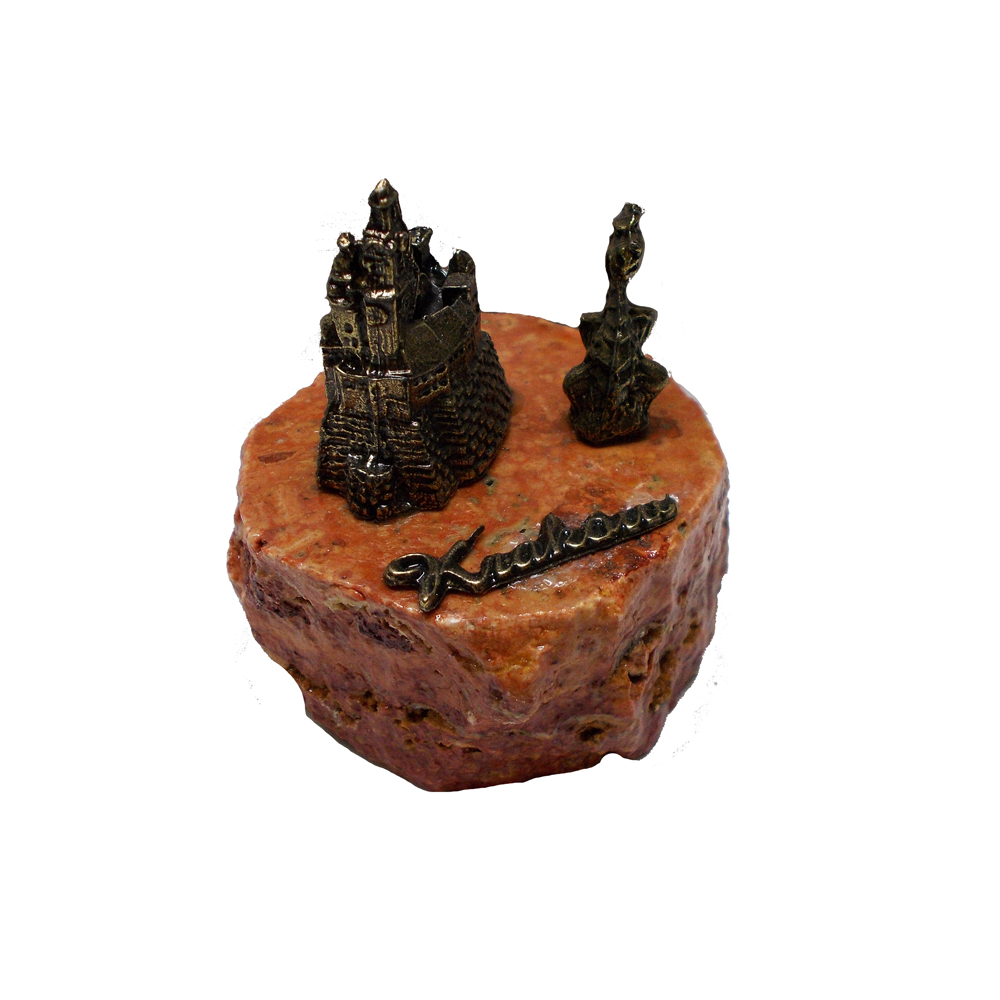 Metalowa figurka smoka oraz zamku wawelskiego na kamieniu o różnych kolorach z napisem Kraków.